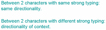 The really interesting part comes when a space or punctuation falls between two strongly typed characters with different directionality, ie. at the boundary between directional runs. In such a case the neutral character, or characters, will be treated as if they have the directionality of the base direction.