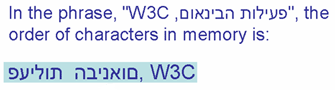In the picture below, the phrase "פעילות הבינאום, W3C" (at the top in blue) appears as it would normally appear when displayed in a right-to-left paragraph. The numbered arrows show the reading direction. You read the sequences in the order of the numbers.