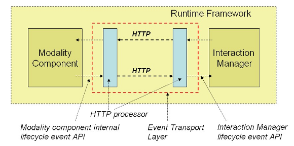 The "Multimodal Architecture and Interfaces" specification supports deployments in a variety of topologies, either distributed or co-located. In case of a distributed deployment, a protocol for the lifecycle event transport needs to be defined. HTTP is the major protocol of the web. HTTP is widely adopted, it is supported by many programming languages and especially used by web browsers. Technologies like AJAX provide asynchronous transmission of messages for web browsers and allow to build modality components on top of it in distributed environments. This chapter describes how the HTTP protocol should be used for MMI lifecycle event transport in distributed deployments. Modality components and the Interaction Manager need an HTTP processor to send and receive MMI lifecycle events. The following picture illustrates a possible modularization of the Runtime Framework, the Interaction Manager and the Modality Components. It shows internal lifecycle event interfaces (which abstract from the transport layer) and the HTTP processors. The HTTP processors are responsible for assembling and disassembling of HTTP requests, which carry MMI lifecycle event representations as payloads.