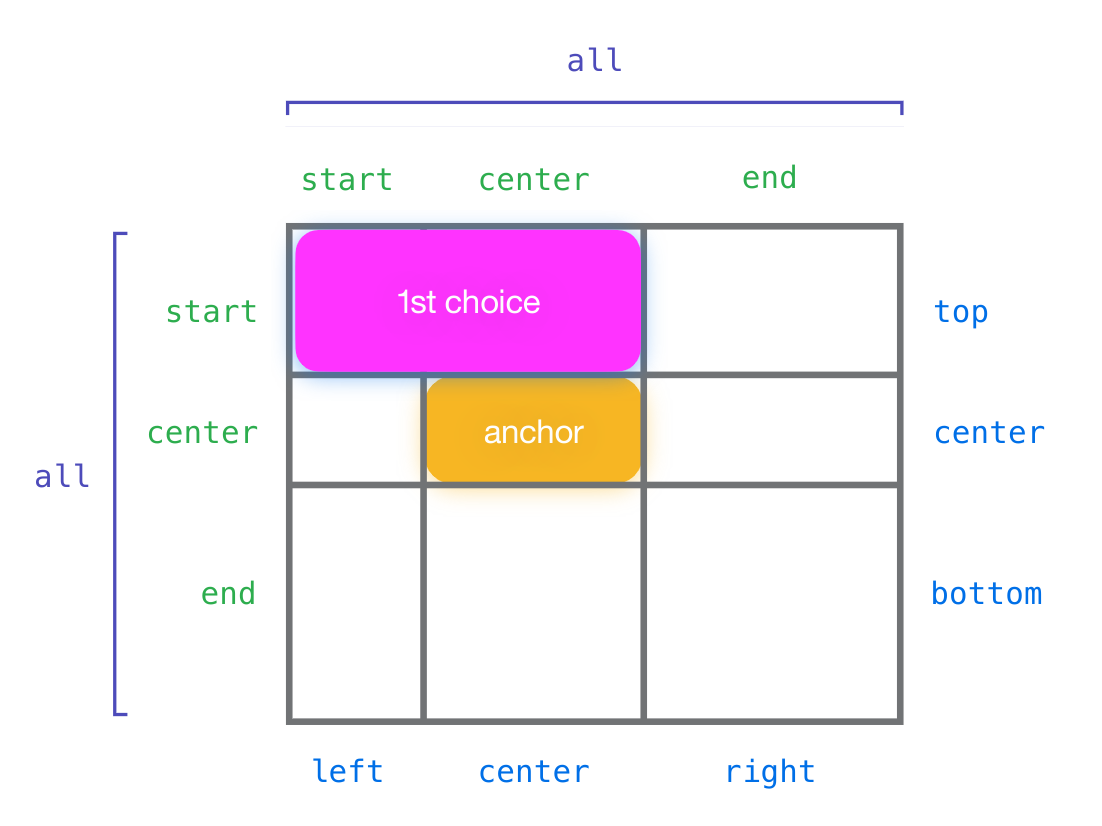 CSS absolute positioning allows authors to place boxes anywhere on the page, without regard to the layout of other boxes besides their containing block. This flexibility can be very useful, but also very limiting—​often you want to position relative to some other box. Anchor positioning (via the position-anchor and position-area properties and/or the anchor functions anchor() and anchor-size()) allows authors to achieve this, “anchoring” an absolutely positioned box to one or more other boxes on the page (its anchor references, while also allowing them to try several possible positions to find the “best” one that avoids overlap/overflow.
